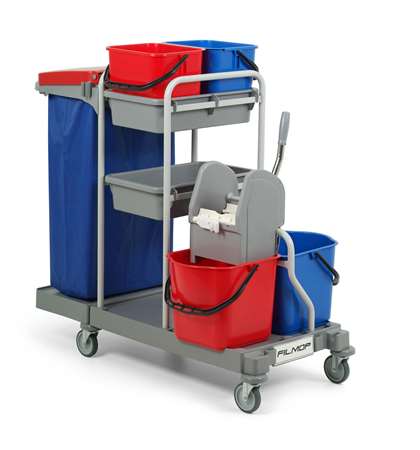 Equipé de : 1 base 85x53cm PERFORMANCE HYGIENE, 4 roues standards 100mm, 4 rondelles pare-chocs, 1 support sac 120L, 1 extension de base, 2 bacs centraux, 2 seaux 12L bleu, rouge, 2 seaux 15L bleu, rouge, 1 support presse, 1 support manche||Couvercle et Sac en option