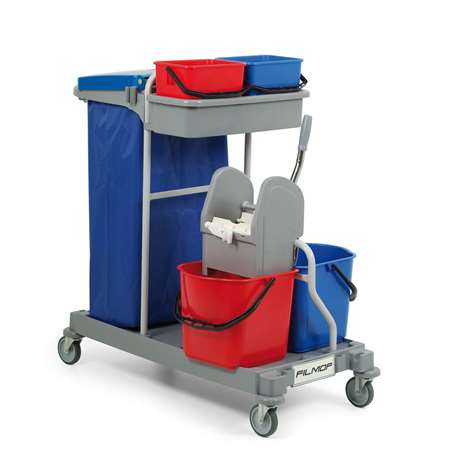 Chariot ARIANE 2115 équipé de : 1 base 95x53cm PERFORMANCE HYGIENE, 4 roues bandage dur 100mm, 4 rondelles pare-chocs, 1 support sac 120L, 1 bac latéral 50x19cm, 2 seaux 6L bleu, rouge, 2 seaux 15L bleu, rouge, 1 support presse, 1 presse à mâchoires, 1 support manche.||Couvercle et sac pour support sac en option.